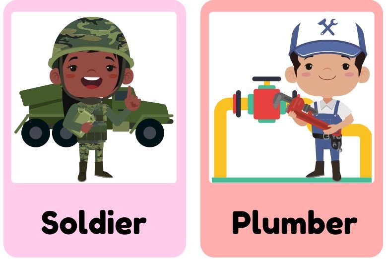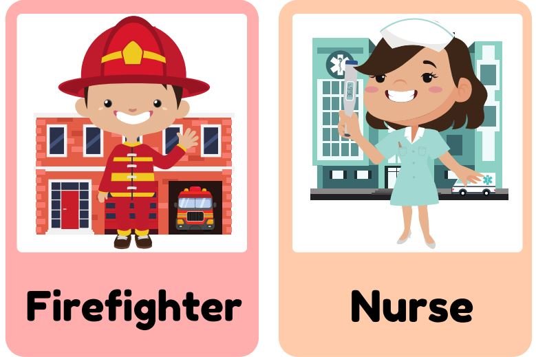 • Includes: firefighter, nurse, garbage collector, farmer, dentist, construction worker, doctor, mail carrier, chef, engineer, car mechanic, soldier, plumber, and more